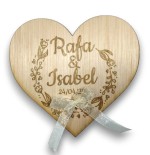 Porta alianzas de madera con forma de elegante corazón, personalizado con vuestros nombres y fecha de enlace.