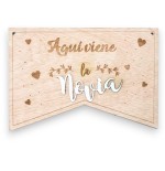 Cartel de madera con el mensaje Aquí viene la Novia, ideal para que tus pequeñas damas o pajes adelanten tu entrada de una forma elegante y original! ligero y cómo de llevar para los más peques.
