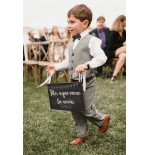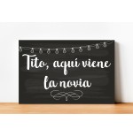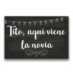 Cartel impreso de madera, con el texto "Tito, aquí viene la novia"