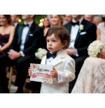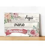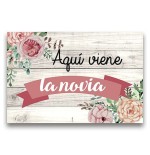 Cartel impreso de madera, con el texto "Aquí viene la novia"