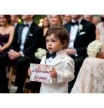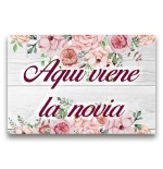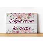 Cartel impreso de madera, con el texto "Aquí viene la novia"