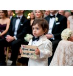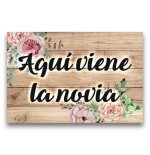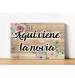 Cartel impreso de madera, con el texto "Aquí viene la novia"