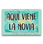 Cartel impreso de madera, con el texto "Aquí viene la novia"