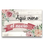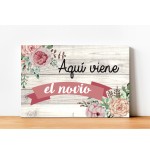Cartel impreso de madera, con el texto "Aquí viene el novio"