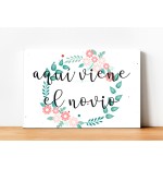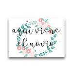 Cartel impreso de madera, con el texto "Aquí viene el novio"