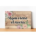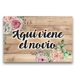Cartel impreso de madera, con el texto "Aquí viene el novio"