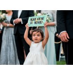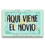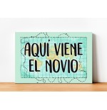 Cartel impreso de madera, con el texto "Aquí viene el novio"