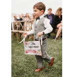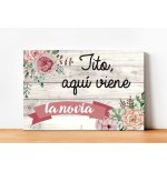 Cartel impreso de madera, con el texto "Tito, aquí viene la novia"