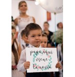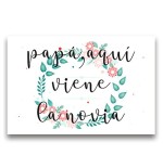 Cartel impreso de madera, con el texto "Papá, aquí viene la novia"