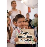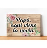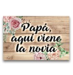 Cartel impreso de madera, con el texto "Papá, aquí viene la novia"