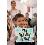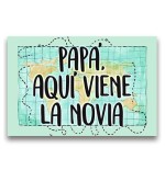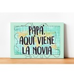 Cartel impreso de madera, con el texto "Papá, aquí viene la novia"