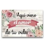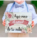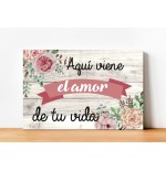 Cartel impreso de madera, con el texto "Aquí viene el amor de tu vida"