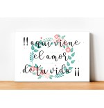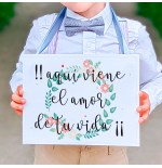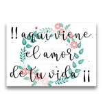 Cartel impreso de madera, con el texto "Aquí viene el amor de tu vida"