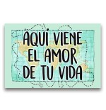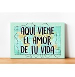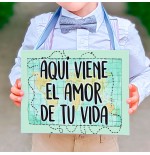 Cartel impreso de madera, con el texto "Aquí viene el amor de tu vida"