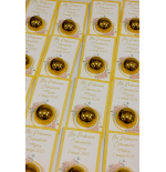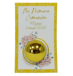 Bálsamo labial en forma de esfera metálica oro, con tarjeta personalizada con nombre y fecha a juego de Primera Comunión.