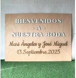Cartel de madera personalizado para boda con elegante detalle de letras en color blanco, y vuestros nombres y fecha grabados a láser, porque cada detalle cuenta, y cada rincón de tu evento es importante por sí solo.