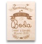 • Diseño: Incluye el texto "Bienvenidos a nuestra boda" según diseño mostrado y personalizado con vuestros nombres y fecha de boda.
