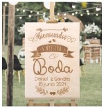Da la bienvenida a tus invitados de manera elegante con este original cartel personalizado de madera, ideal para decorar cualquier rincón de la celebración.