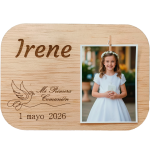 No olvide guardar su personalización para poder añadirla al carritoOriginal marco de fotos fabricado en madera y con imán trasero para que tus invitados puedan tener un bonito recordatorio de tu comunión, colocado en cualquier superficie a modo de portafotos o en el frigo.