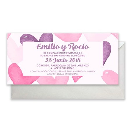 Anuncia tu gran día con una invitación de boda sofisticada y delicada, diseñada en hermosos tonos morados y lila, con detalles de corazones que simbolizan el amor y la unión.