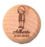 Encantador yoyo de madera natural con diseño de niño de comunión, personalizado con nombre y fecha. Un detalle único y especial para regalar a tus invitados en este día tan especial.