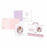 Este pack de Comunión incluye álbum o libro de recuerdos, carpeta y elegante maletín decorativo a juego, ideal para organizar fotografías, dedicatorias, recordatorios y pequeños detalles de la celebración. Su diseño dulce y cuidado lo convierte en un regalo perfecto para niñas en su Primera Comunión.