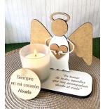 Incluye la frase y la vela personalizada en la tapa con la frase y el ser querido a quien se lo dediques. Si quieres una frase especial para la base o tienes alguna duda escríbenos a nuestro whatsapp pinchando AQUI