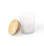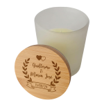 Vela aromática de vainilla con diseño personalizado grabado en tapa de bambú.